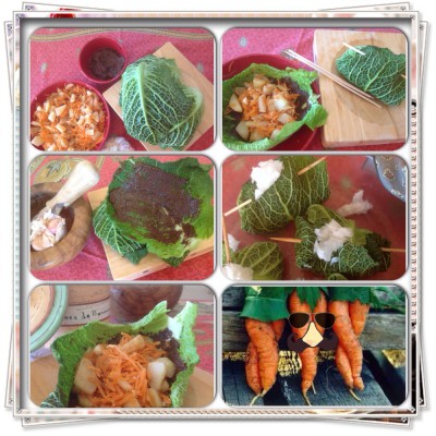 Déposez ce mélange dans chacune des feuilles de chou, fermez chaque feuille en rentrant les côtés puis en rabattant le dessus et mettez un bâtonnet en bois pour clore le tout.