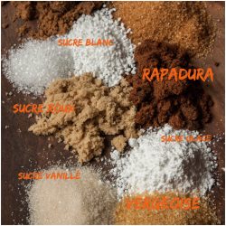 - Les sucres complets comme le rapadura ou le sucanat ou le muscovada: sucres bruts contenants des vitamines B,PP,H,C, des oligo-éléments comme du potassium, du fer, du sélénium, du magnésium, des acides aminés, acide folique…