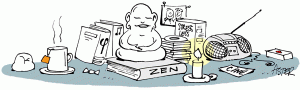 Si vous pratiquez la méditation, installés en posture du lotus, vous pouvez comprendre cette image pourtant historique. Effectivement, il y a fort longtemps, le papier-toilette n’existait pas et l’utilisation d’un bâtonnet plat était de rigueur. Donc en posture du lotus (zazen), on nettoie toutes les impuretés de notre corps et de notre esprit.