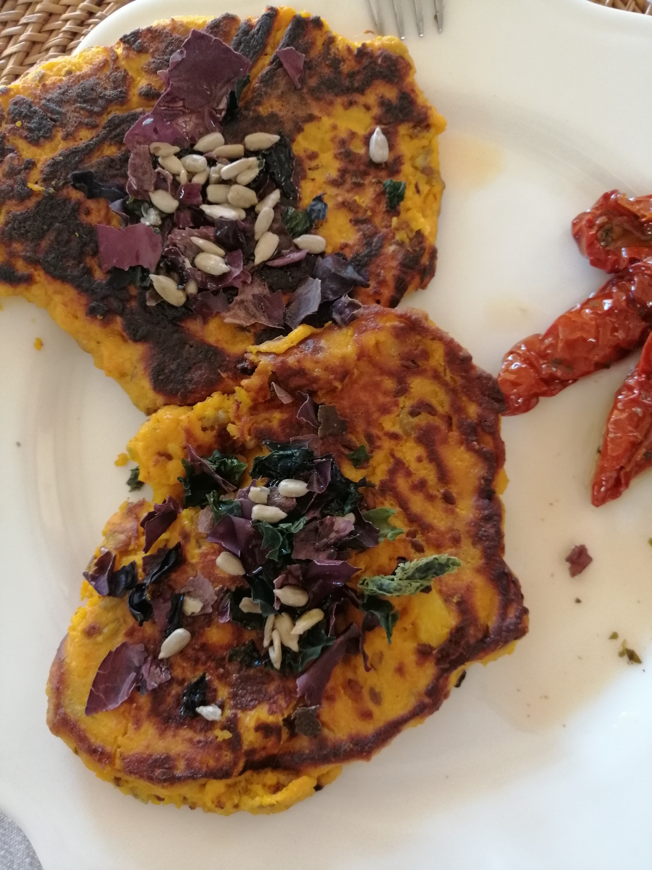 Mettez 2 galettes par assiette en les décorant des algues, les graines de tournesol, d’un peu d’huile d’olive et d’un tour de moulin de 5 baies.