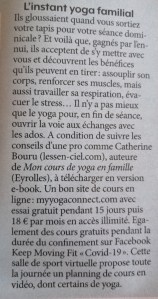 Je vous présente mon premier bébé papier : « Mon cours de yoga en famille » 80 postures et activités ludiques pour me relaxer avant de dormir de Catherine Bouru, Editions Eyrolles, préface Marie-Jeanne Trouchaud, illustrations Leslie PLée, ouvrage dirigé par Anne Ghesquière .
